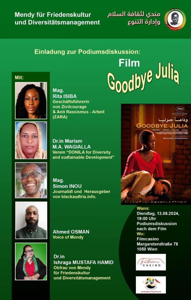 Mendy will organize in cooperation with the Film Casino on 13.08.2024 panel discussion after showing the sudanese film: Goodbye Julia.